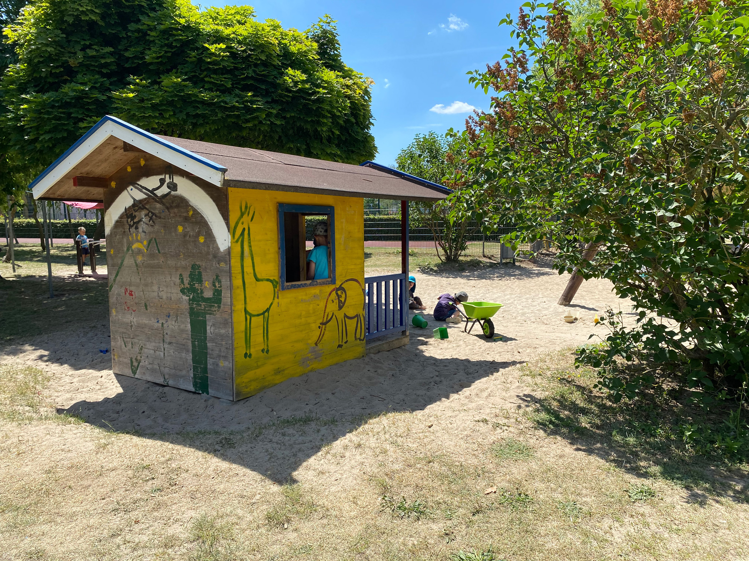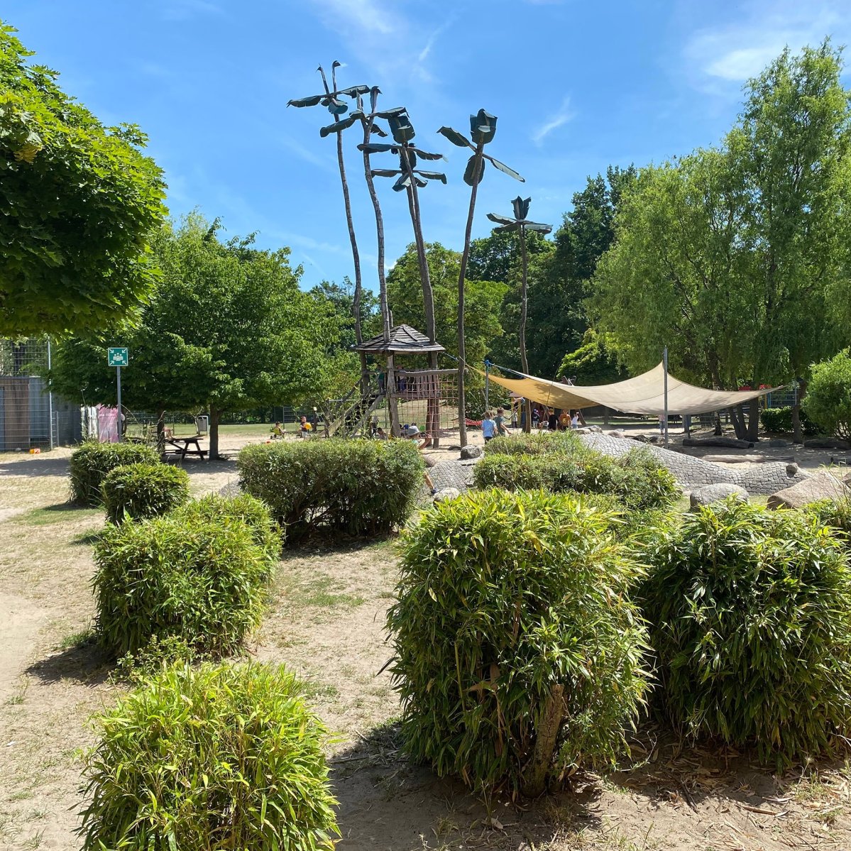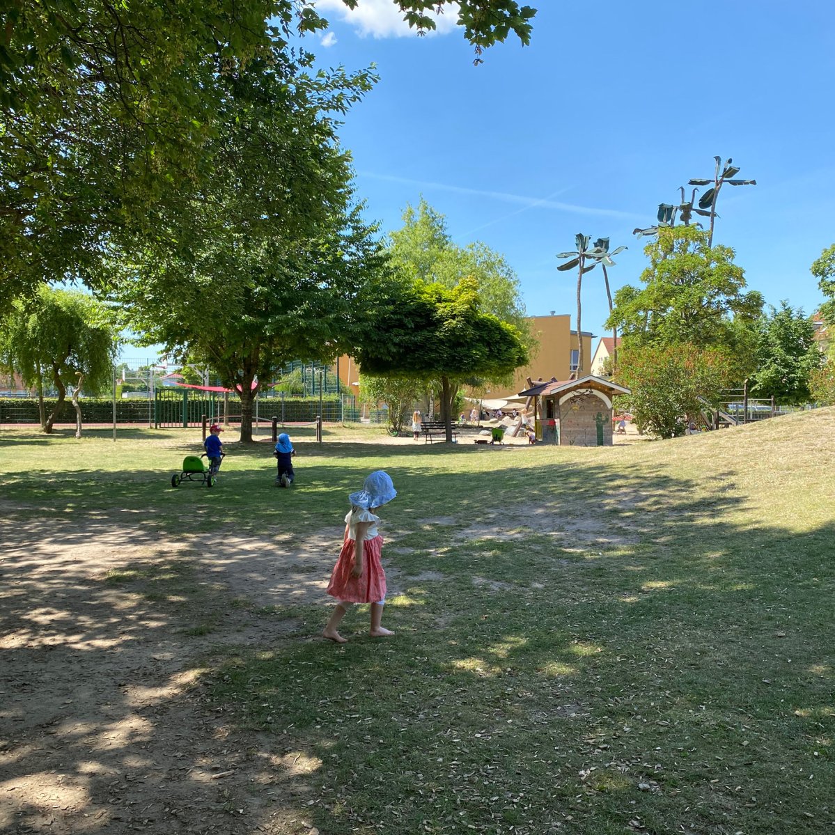 Rund um unser Haus befindet sich ein etwa 4.500 Quadratmeter großes Außengelände. Ein großer Spielplatz mit Palmenhaus lädt die Kinder zum Klettern und Rutschen ein und ist gleichzeitig das Wahrzeichen unserer Kita.