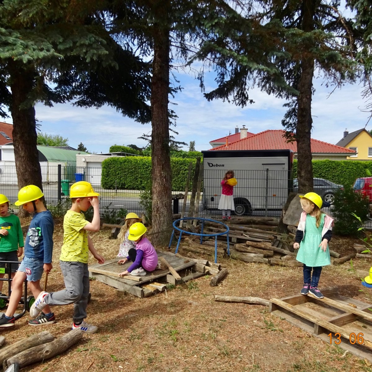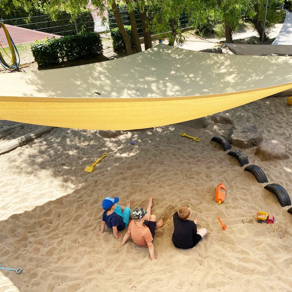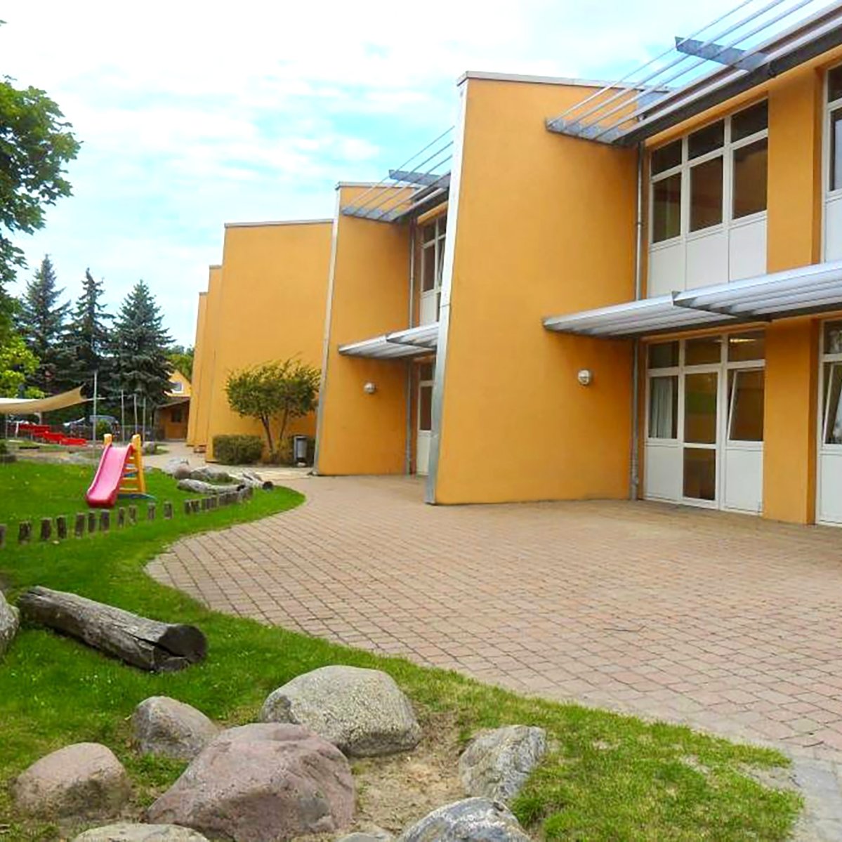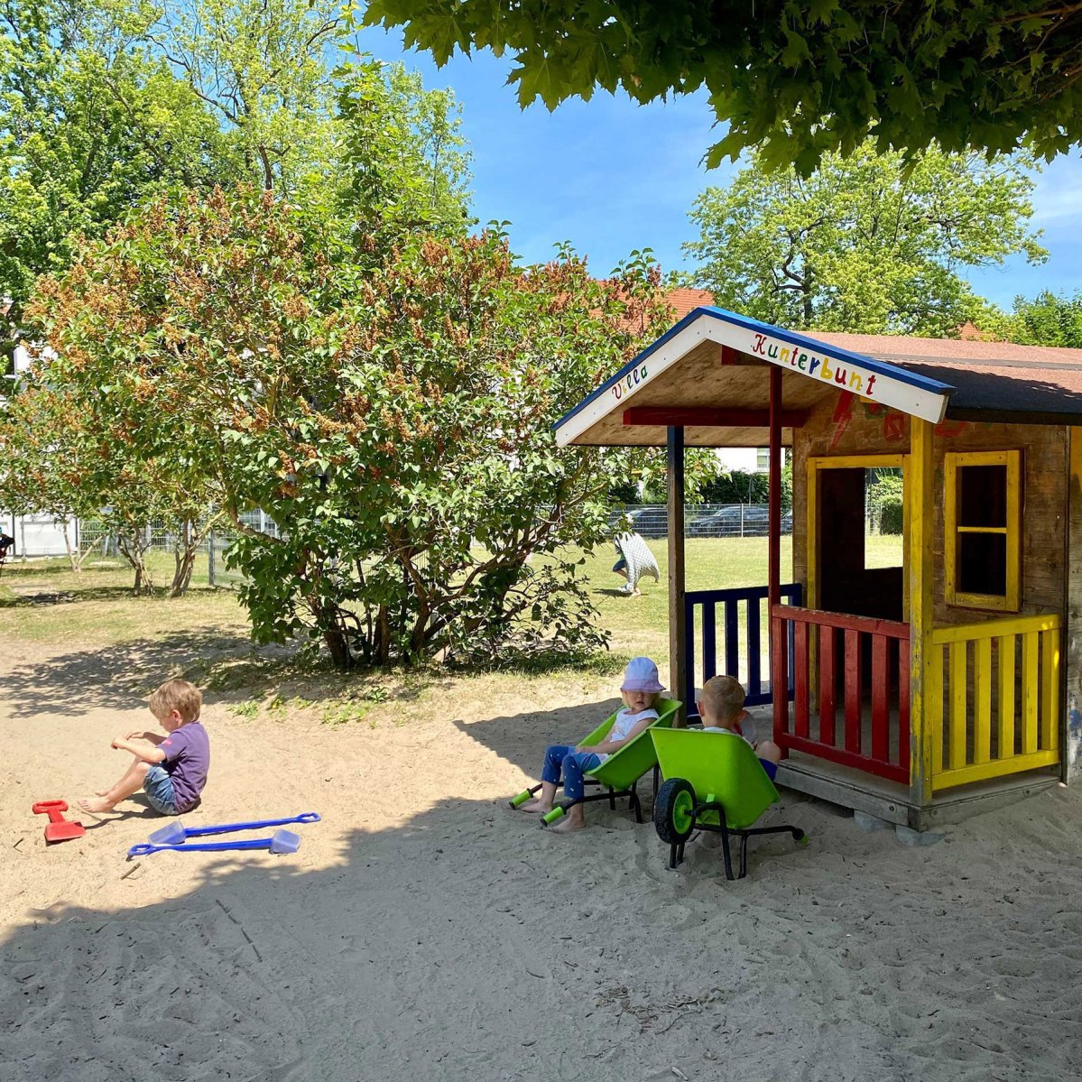 Rund um unser Haus befindet sich ein etwa 4.500 Quadratmeter großes Außengelände. Ein großer Spielplatz mit Palmenhaus lädt die Kinder zum Klettern und Rutschen ein und ist gleichzeitig das Wahrzeichen unserer Kita.