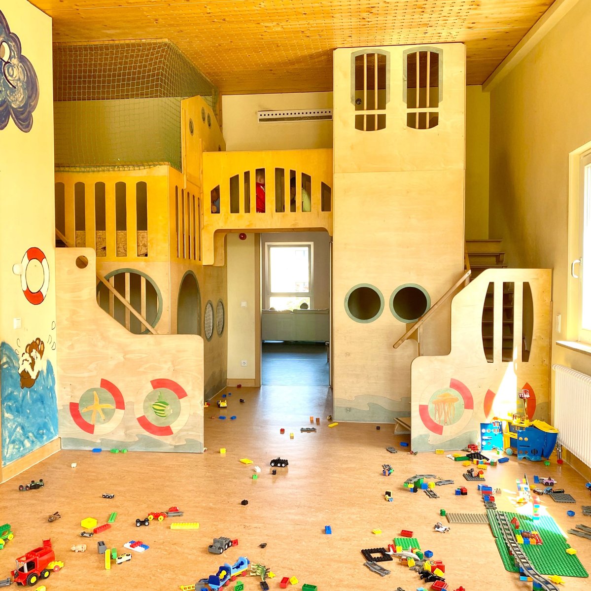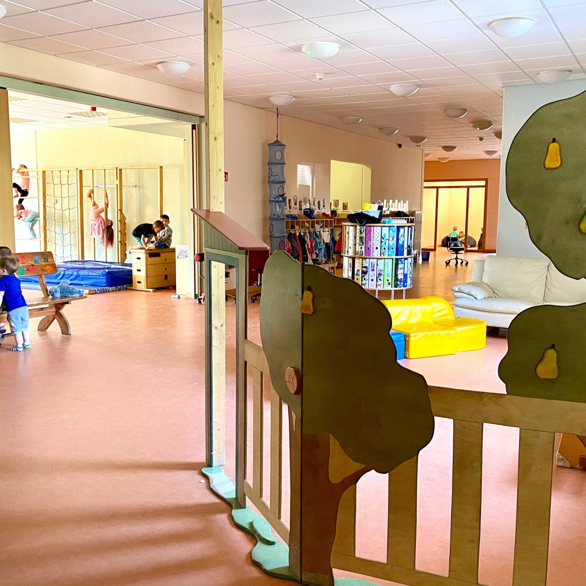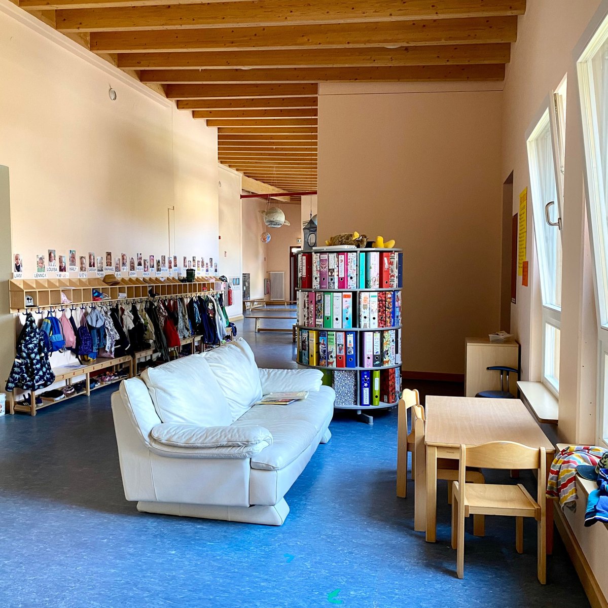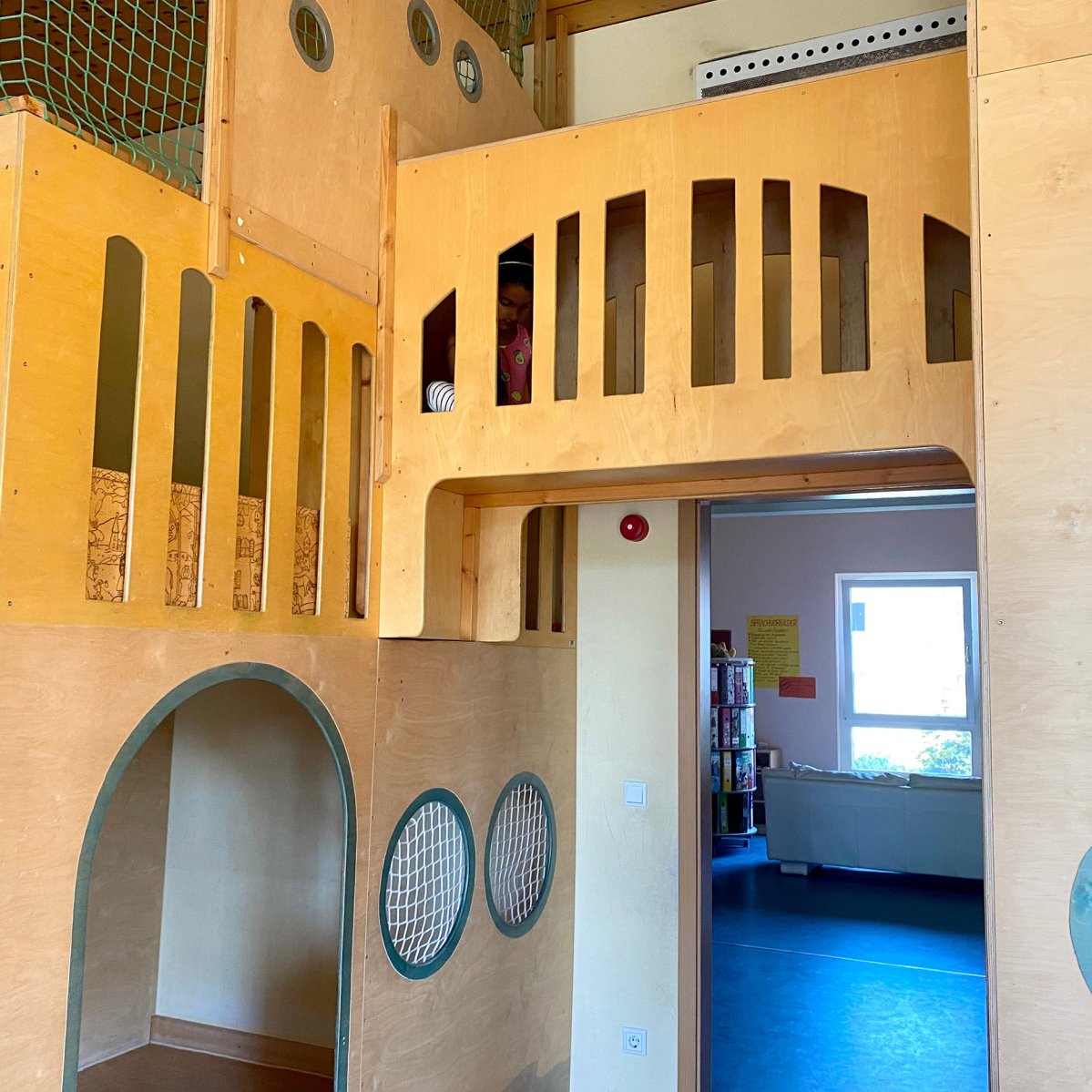 In der unteren Etage befinden sich der Krippenbereich, der Platz für 22 Kinder bietet, sowie ein Teil des Kindergartenbereiches. Außerdem das Büro der Kita-Leitung, das Zimmer für Erzieher*innen und die Küche.