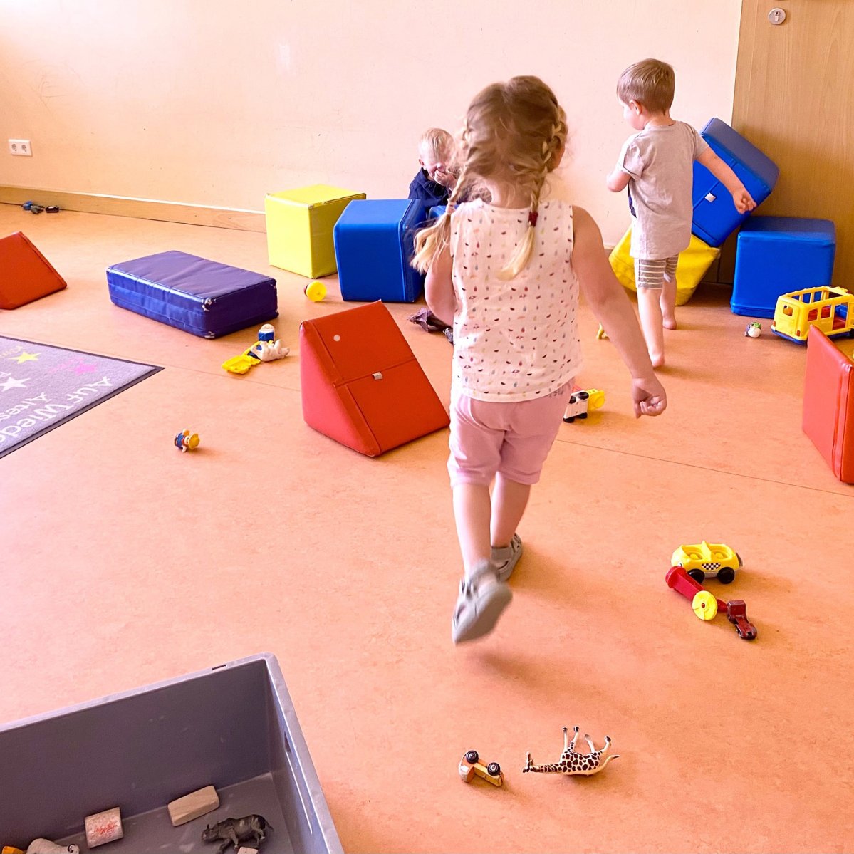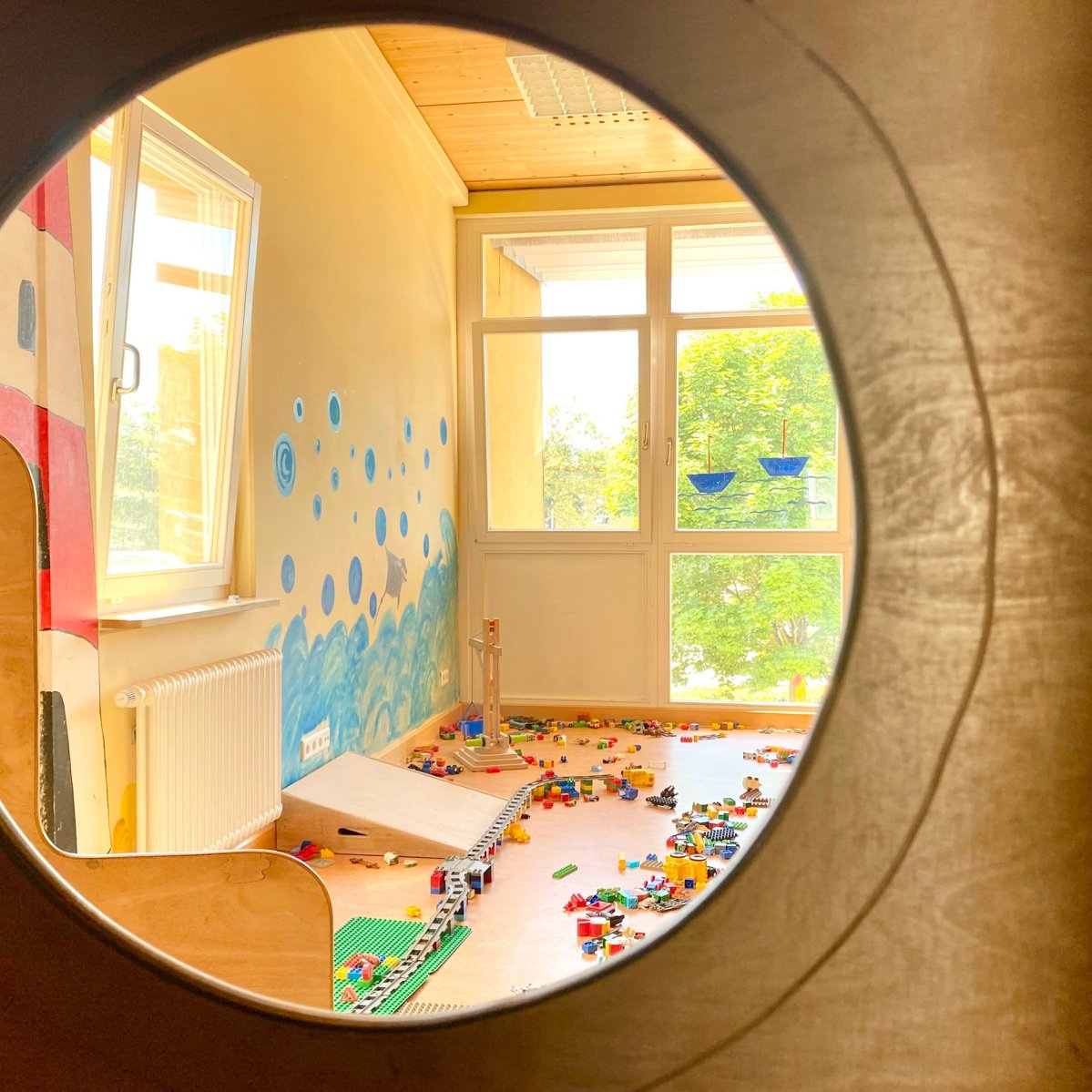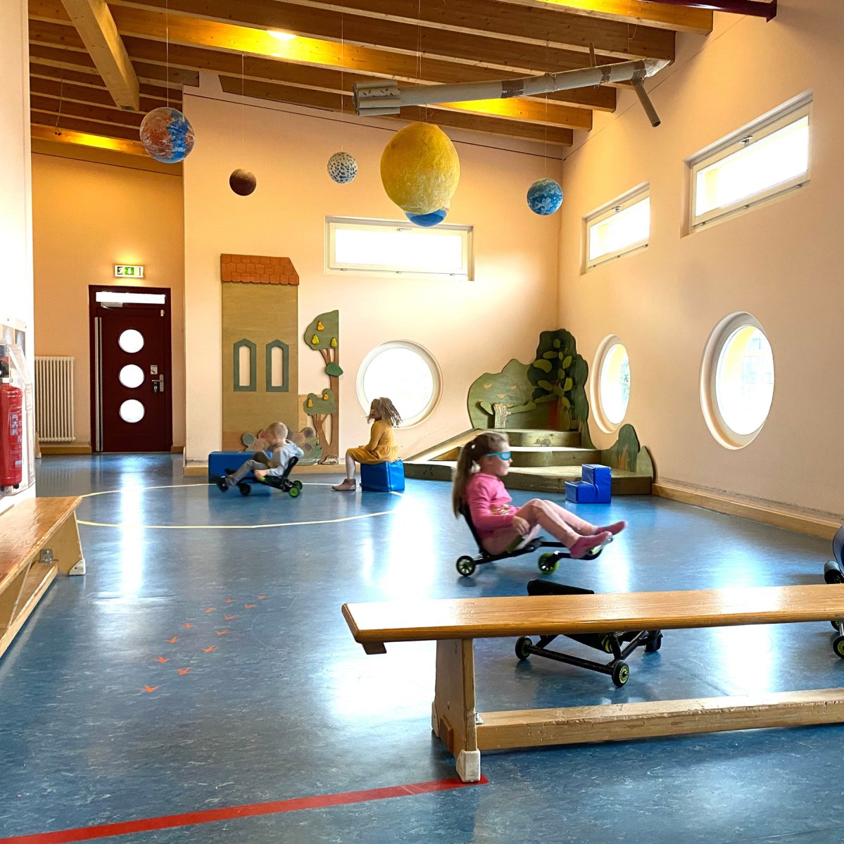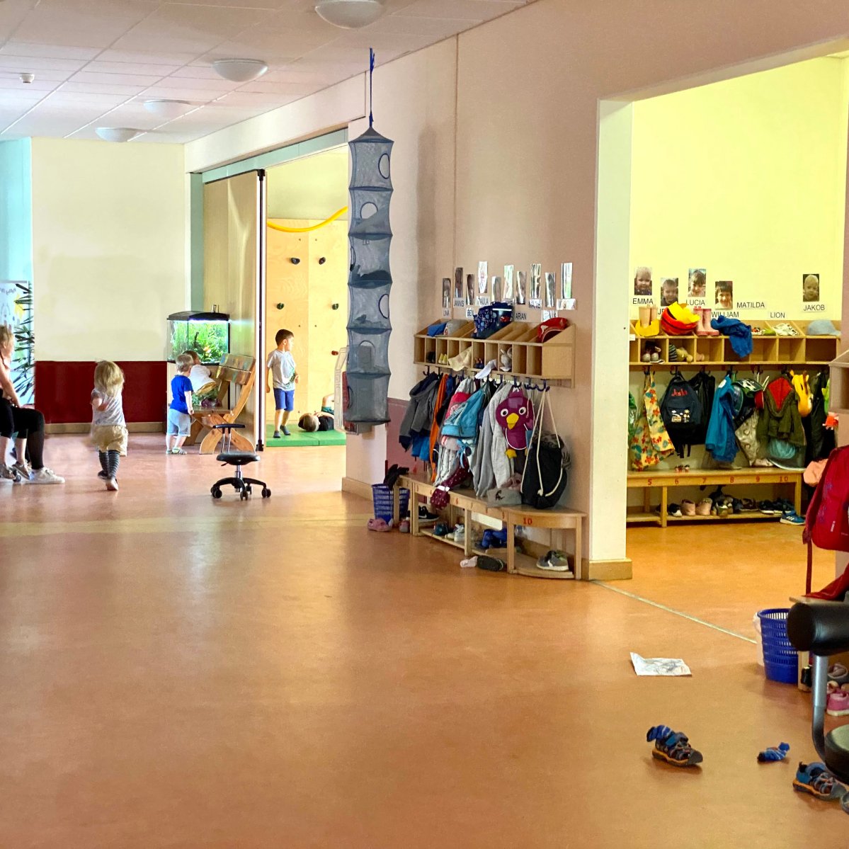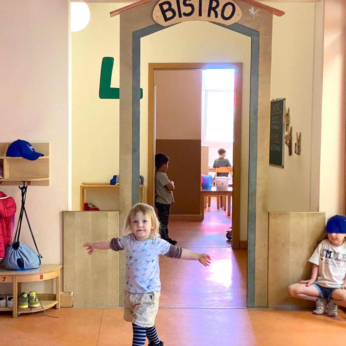 In der unteren Etage befinden sich der Krippenbereich, der Platz für 22 Kinder bietet, sowie ein Teil des Kindergartenbereiches. Außerdem das Büro der Kita-Leitung, das Zimmer für Erzieher*innen und die Küche.