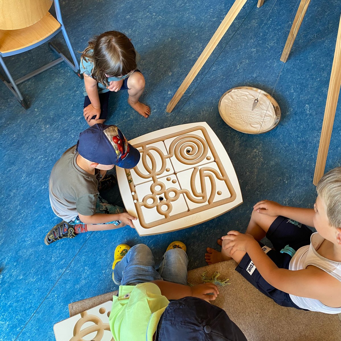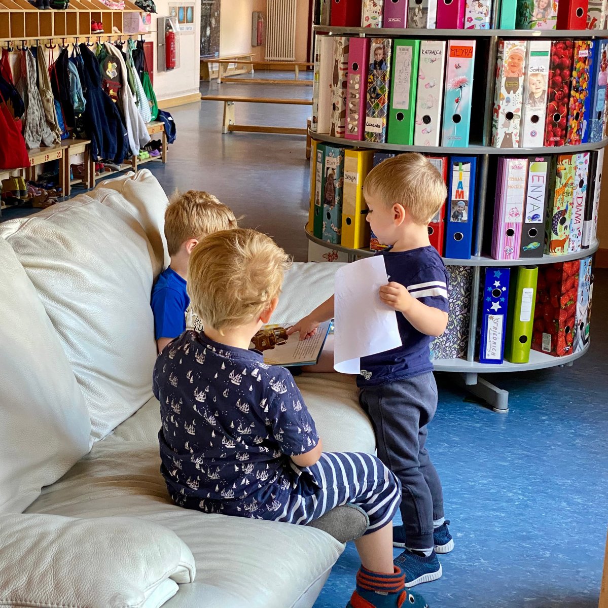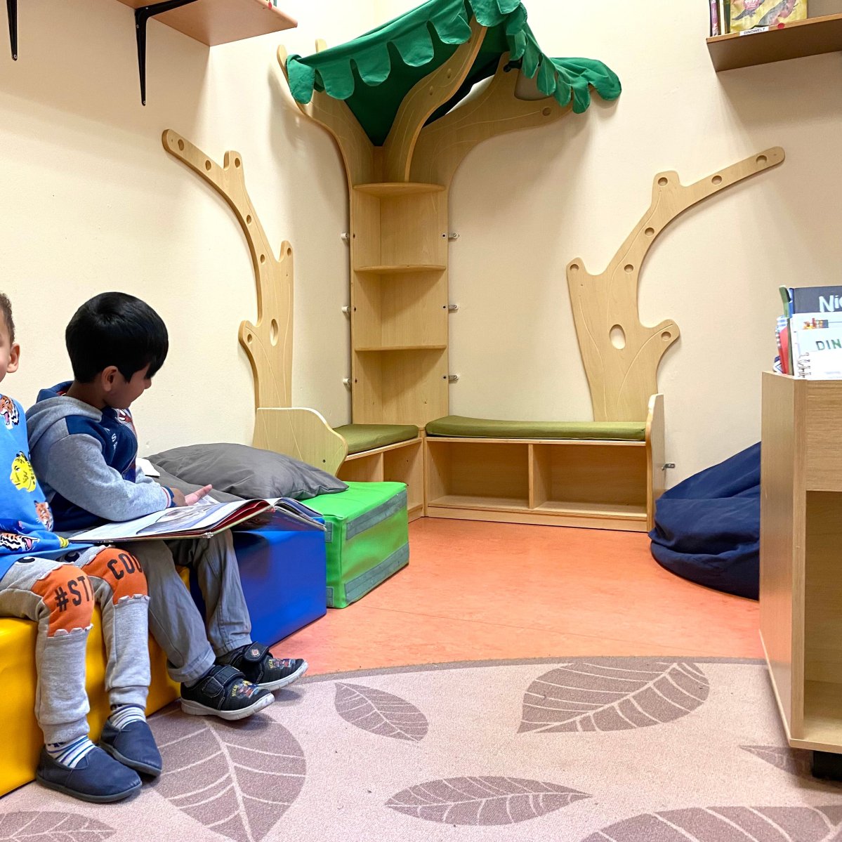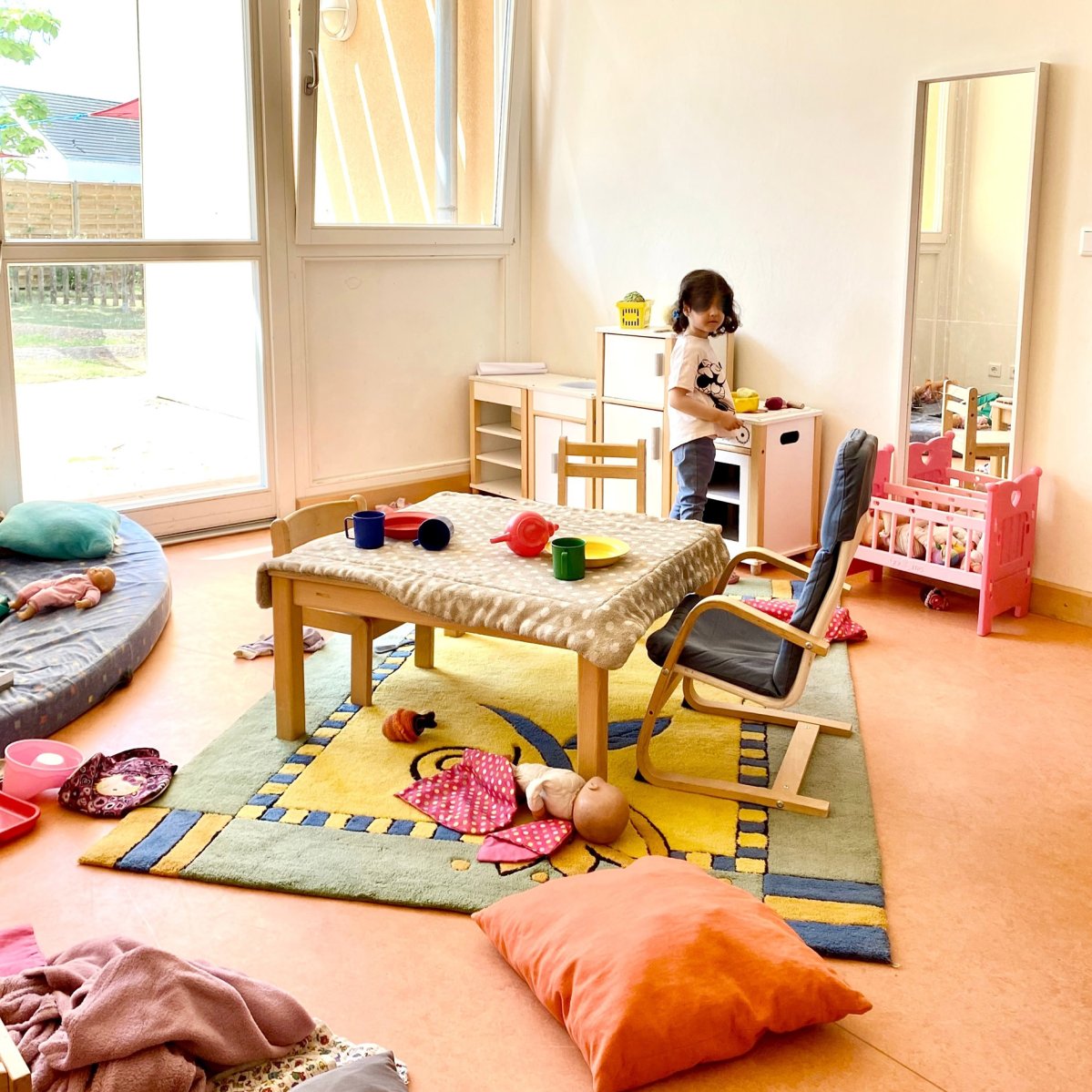 In der unteren Etage befinden sich der Krippenbereich, der Platz für 22 Kinder bietet, sowie ein Teil des Kindergartenbereiches. Außerdem das Büro der Kita-Leitung, das Zimmer für Erzieher*innen und die Küche.