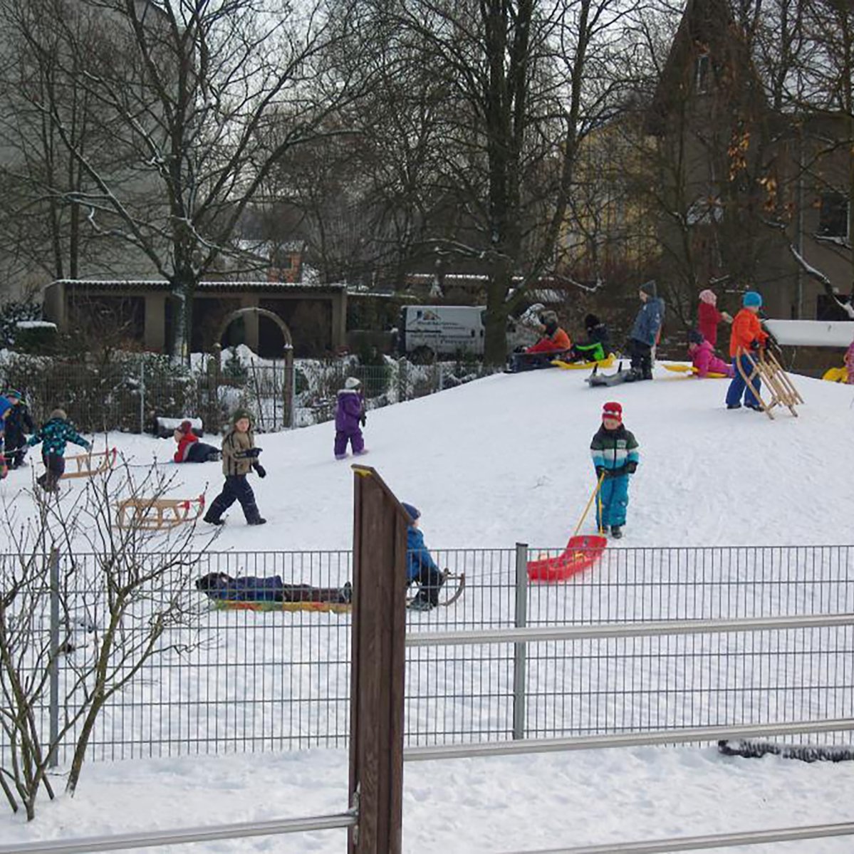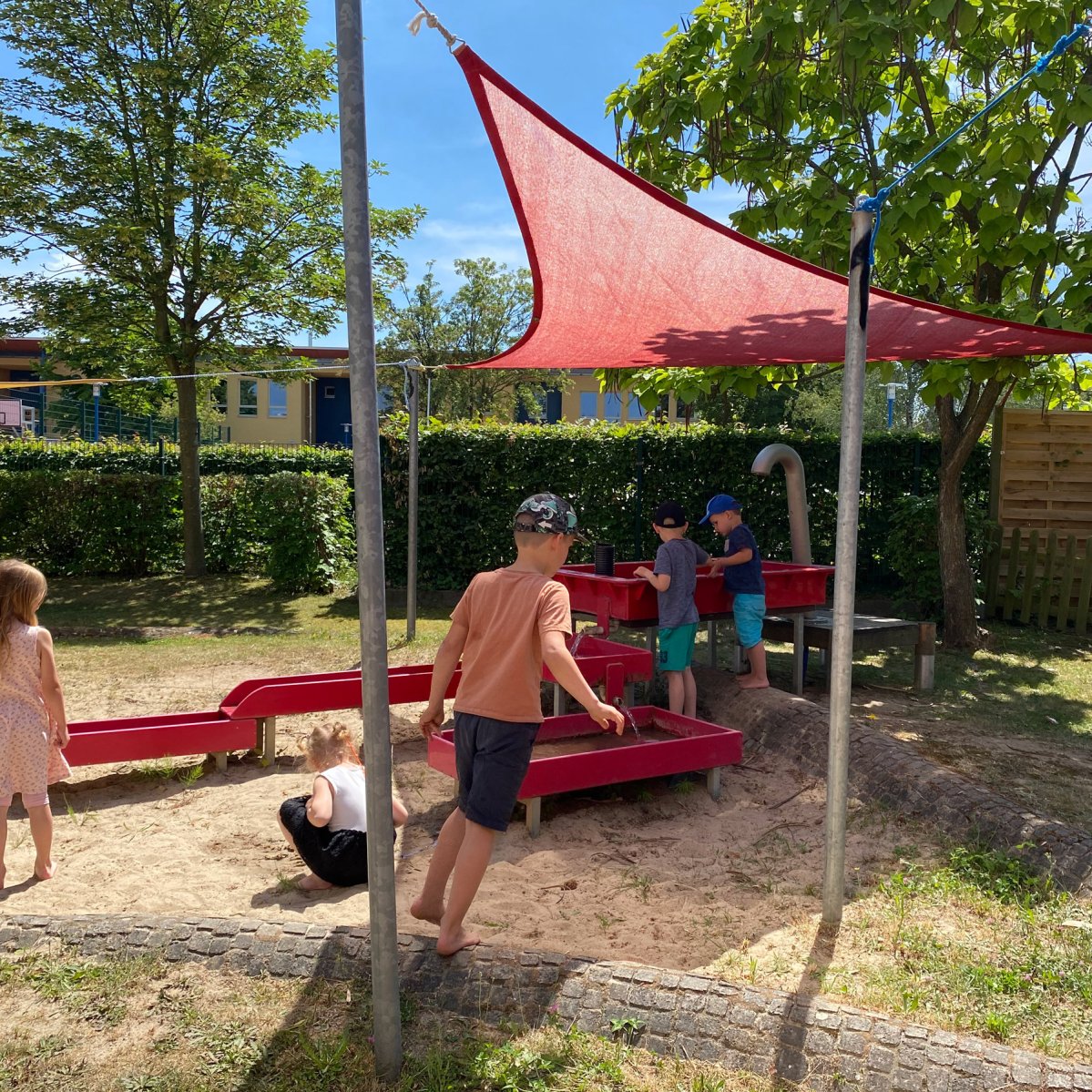 Mehrere attraktive Spielobjekte bieten Möglichkeiten zur aktiven Bewegung. Unser kleines Wäldchen mit Berg zum Rodeln und Rollen beflügelt die Abenteuerlust der Kinder. Matschen an der Wasserspielanlage und die "echte" Baustelle fordern immer neue Ideen heraus.
